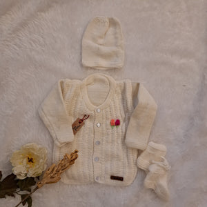 Dress your toddler in this beautifully handmade white sweater set. The set includes a soft and cozy woolen sweater, a matching cap, and adorable booties, making it a complete winter outfit.